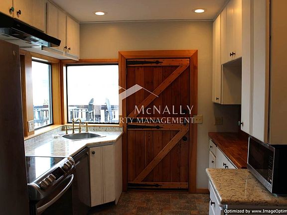 The main living space features vaulted ceilings, exposed wood beams, and skylights that fill the home with light. The kitchen flows into the living and dining area, creating a welcoming layout, even offering the convenience of a half bathroom on the main level. A sunroom and expansive decks allow you to soak in the panoramic views all year long. Downstairs, a spacious bedroom with a full bathroom includes a stacking washer and dryer for added convenience. The home is equipped with mini-split AC/heat units to keep you comfortable throughout every season. In addition, there are stairs to the water, and an outdoor shower - perfect for relaxing evenings by the water. Outside shed for storage. This is a No Smoking and a Pets Negotiable Property. Applications are accepted only through McNally Property Management.