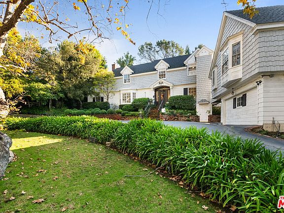 Sunset Boulevard's much admired Sycamore Bend is now available for purchase for the first time in over sixty-three years. Shingle-clad and built originally in 1941, its infinitely charming traditional architectural elements have been lovingly cared for and carefully preserved over the years. Impressively set back from the street up a gentle, grassy knoll and framed by a majestic Sycamore, this wonderful home is surrounded by full mature landscaping and accessed easily by a convenient circular driveway. A welcoming formal foyer leads to the sunny living room with its crown, dentil moldings, stately fireplace, bay window and French doors leading out to the backyard. Peg-and-groove hardwood floors grace much of the first floor. The charming den, with its beamed ceilings, brick fireplace and built-in cabinets also has a wet-bar with a soda fountain. It also leads out to the backyard. The formal dining room, with its wainscoting, crown moldings and bay window has room for two tables. The country kitchen has wood paneled cabinetry, some with glass-faced doors, original period hinges, wood beamed ceiling, stainless steel appliances and a very sweet breakfast nook. A very cozy, yet spacious, downstairs ensuite bedroom has beamed ceilings, paneled walls and its own bath. A service area/laundry room and a powder bath complete the first floor. A lovely staircase leads to the upstairs landing and to three terrific bedrooms. The primary, with its tall pitched and beamed ceilings, has a romantic fireplace, a large bath with a separate tub and shower and an unusual amount of closet space for its vintage. It also has a very nice sitting room, perfect as an office, small gym or even as a nursery. The upper terrace, taking in peaceful views of the backyard, can be accessed from here. Two additional, cheerful, amply-sized family bedrooms share a full bath. The peaceful backyard is maturely wooded and has a large, covered porch for easy al fresco entertaining. There's also a wide expanse of grass for kids to play upon. Added much later but in careful keeping with the style of the main house, a guest house also graces this special property. It features a full kitchen with a breakfast bar, laundry facilities and a very comfortable living area with tall, pitched and beamed ceilings, a bay window with a window seat, plenty of built-ins, an open bedroom nook and a loft, perfect for use as an office or as a second sleeping area. In the main house, an elevator effortlessly accesses all the way up from the driveway level to the first and second floors. There's a two-car garage and plenty of off-street parking in the circular driveway including a covered carport for the Guest Unit. There is extensive storage space in both the attic and in the cellar. Inclusion in the Warner Avenue Elementary School district. All this, moments from UCLA and from Westwood, Brentwood, Century City and Beverly Hills and all the fine shopping and dining each area affords. Please ask listing agent about quoted square footage. Although neither Broker nor any of its Agents nor Seller guarantee the accuracy here, according to an appraiser's measurement (please see attached floor plan in photos section of the listing), the Main House measures 3,257 square feet and the Guest Apartment measures 679 square feet for a total of 3,936 square feet. See agent about exclusions, please.