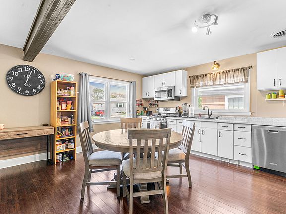 Shared asphalt side driveRefreshed open style kitchenGleaming white cabinetsEngineered flooringStainless steel appliances