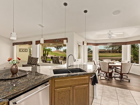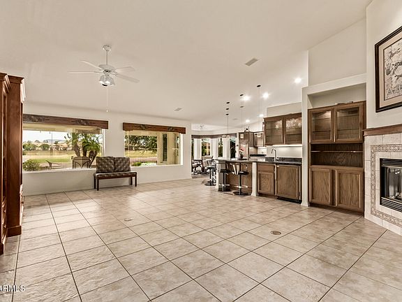This prime location places you close to community pools, fitness centers, pickleball courts, and all the Sunland Springs Village amenities—plus right next to shopping, dining, and grocery stores. Step inside to find 2 bedrooms, a den, an office, and 3 full baths, all freshly painted and professionally cleaned. The open-concept living room boasts a gas fireplace and a wet bar with refrigerator. The kitchen features Kosmus granite countertops, matching bar stools, stainless steel appliances, a wine cooler, and custom McCarthy cabinetry - also found throughout the den and office. The master suite offers motorized blinds, a walk-in closet, and a bathroom with granite counters and dual lighted sinks.