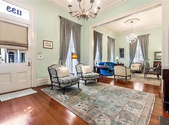 Glorious Garden District home recently renovated. Formal living & dining rooms, 12' ceilings, original wood floors, graced by crown molding & medallions. Library has wet bar tucked behind cypress doors. Two beds downstairs separated by pretty marble bath. Tidy kitchen & breakfast area. Master suite on upper floor, bath w/ fabulous tile & marble surround. Luxurious closet w/ coffee bar. 4th bedroom is used as den. Blocks from parade route. Screened back porch overlooks bricked patio with raised garden & pond