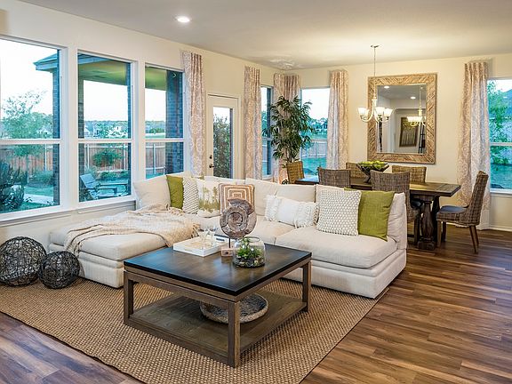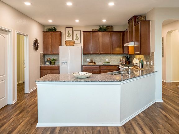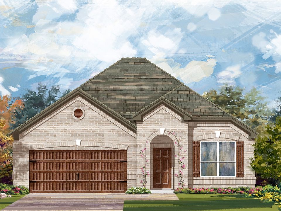 This beautiful single-story home features an open floor plan with 9-ft. ceilings and a roomy kitchen that opens to a spacious great room with fireplace. The kitchen offers Woodmont® raised panel maple cabinets in Espresso, granite countertops in Arctic Pearl and tile backsplash. The master suite features a walk-in closet, and the adjoining master bath boasts a dual vanity with Silestone® countertop, a garden tub with tile splash and separate shower with tile surround. Additional features include a front yard sprinkler system, full house gutters, plush Shaw® carpeting in the bedrooms, tile flooring in the bathrooms, stylish vinyl plank flooring at the entry, great room, and kitchen, Generation Lighting® fixtures, Sherwin-Williams® low VOC interior paint in Alabaster, 2-in. faux wood cordless blinds in White, 2-panel Camden interior doors, an 8-ft. front entry door and a Wi-Fi smart thermostat. Relax and entertain outdoors on the extended covered back patio.