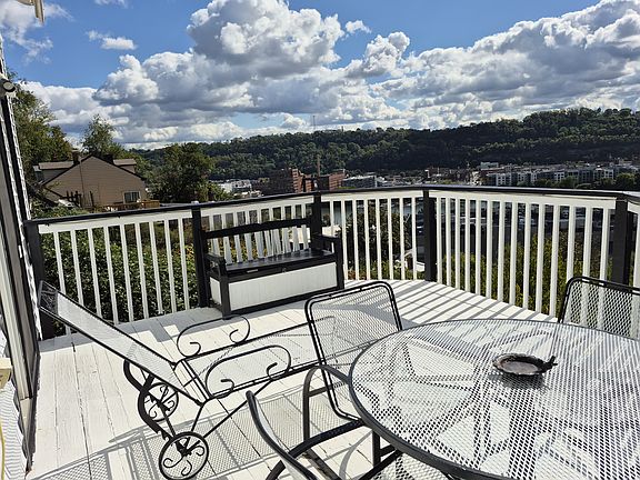 Stunning full view of downtown Pittsburgh skyline from living room, dining area, deck, and master bedroom. Fully furnished (negotiable): master bedroom, king size 8 piece high end Herendon bedroom suite with 2 additional closets, and tv. Second bedroom, full size bed, 1 dresser, 1 shelf, night stand and 1 closet. 2 full baths, upstairs with new modern walk in shower and laundry machine and dryer and full bathroom on first floor. Living room, off-white reclining leather couch and love seat and tv, dining area, long wooden dining table, kitchen stainless steel refrigerator/freezer, oven and dishwasher. Off street parking for 3 to 4 cars. Negotiable use of 1 car garage.