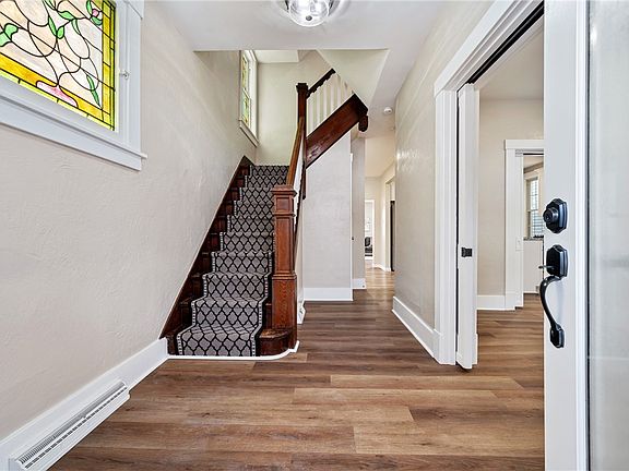 Vintage charm and modern comfort strike a perfect balance in this 4 bedroom, 2.5 bath home. Custom-designed upgrades blend masterfully with preserved elements of character. Experience the beauty of the stairway and original stained glass windows as you enter. Through the double pocket doors of the living room is an impressively remodeled kitchen featuring granite countertops, stainless appliances, island with seating, ample storage, pantry and dining space. The family room and powder room are adjacent offering a bright and cheerful space to entertain. On the 2nd level are 3 bedrooms with original hardwood floors, updated full bath and storage closet. The 3rd floor has been completely renovated to create an owner’s suite and luxurious full bath. The walk-out basement offers loads of storage, laundry and separate room flexible to your needs. The backyard leads to the 2 car detached garage. Great walkable location convenient to the “T”, Keystone Oaks School, shopping and restaurants.