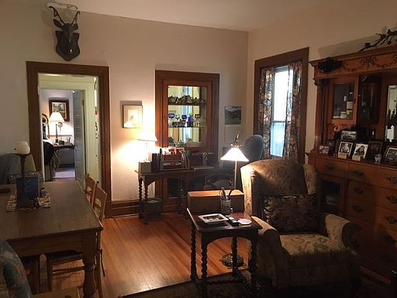 No boring white box living for you! Charming ground floor unit in a lovely old mansion. You and your guests will be wowed with the original, unpainted Victorian charm of the entrance hall woodwork and its bookcase brimming with books. Lots of warm wood details inside - TWO intricately carved, built-in breakfronts provide lots of storage. Large living room has space for an office desk at one end while leaving room for sofa or chairs for TV watching at the other end. Comfortable, clean white kitchen. Your own back door opens onto a deck - enjoy the out-of-doors in the summer. Easy access to the new washer and dryer in the basement. Close to downtown. $1,195. 750 sq. ft. Available now! Call for a showing today!