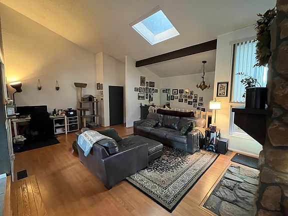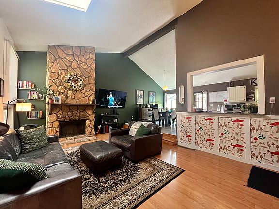 Step inside to vaulted ceilings, a bright skylight, and a cozy wood-burning fireplace that create an open yet welcoming atmosphere. The kitchen features granite countertops and flows seamlessly into the dining and living areas perfect for gatherings.