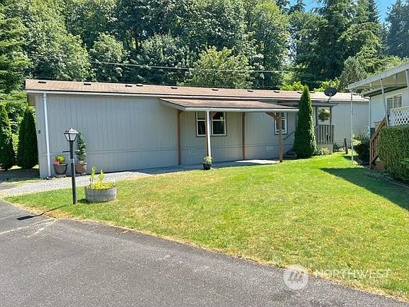 Enjoy living between 2 great citiies Bothell & Woodinville Blocks away from Northshore Senior Center, Sammamish River Trail, parks & shopping close to I-405 & 522. Watch Eagles Blue Herons & wildlife in this 55+ Community. Socialize at the Community building to read, play pool or entertain with full kitchen. Walk the loop & meet your neighbors (approx 1/4 mile lap) Pride of Ownership with an Open Living Room, Cathedral ceilings & fan for spacious feel. Kitchen has open counter & cupboard space. The main bedroom w/attached bathroom is at opposite end of home from the exercise or guest bedroom. Easy access to the deck for entertaining & enjoy the landscaping. Park YOUR vehicle under the carport