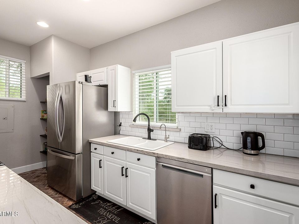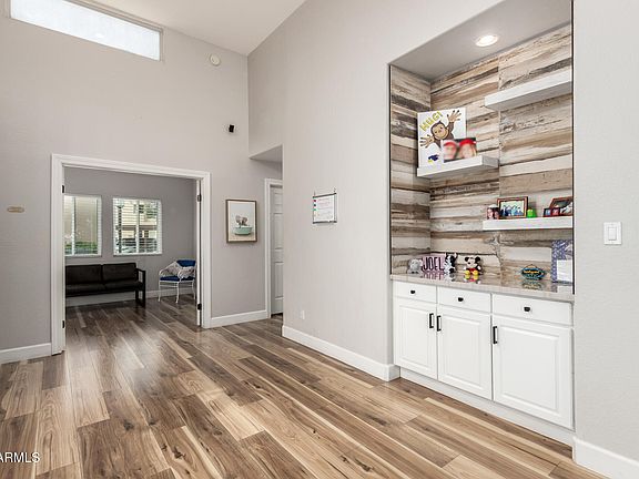 Rare end-unit patio home in Mission Del Arroyos offering privacy, upgrades, and mountain views. This single-level 3 bed, 2 bath features solid plank flooring, fresh interiors, and a cozy fireplace. The remodeled kitchen boasts quartz counters, stainless appliances, breakfast bar, and pantry. Recent improvements include new AC (2023), water heater (2024), dual-pane windows, and LED lighting. Enjoy two spacious patios backing desert open space—perfect for relaxing or entertaining. Community amenities include pools, spa, fitness, and tennis. Ideally located near Kierland, TPC Scottsdale, spring training, and Talking Stick. A true lock-and-leave lifestyle in North Scottsdale!