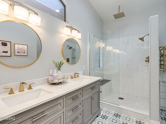 Beautiful home with breathtaking mountain views in Rams Canyon! Extremely close to trails, restaurants, hospital, & Catalina State Park. This home features 3 bedrooms, 2 full baths, pool, & gorgeous views of the Catalina Mountains. You are welcomed by mature trees & shrubs as you walk to the front door. Interior includes ceramic tile in walkways, Living Room, Breakfast Nook & Master Bedroom, vaulted ceilings, water filtration system & stainless-steel appliances. Recently updated Primary Ensuite features stunning dual sink vanity, custom tile shower w/rain showerhead, towel warmer, gold hardware, surround sound speaker & nightlight setting for overhead lighting. Exterior features large backyard w/extended patio, pergola, built-in BBQ & refrigerator, fireplace & pool w/heater.