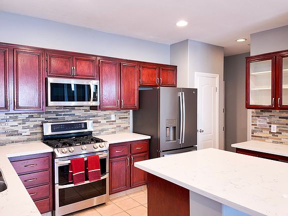 Stainless steel appliances and quartz countertops
