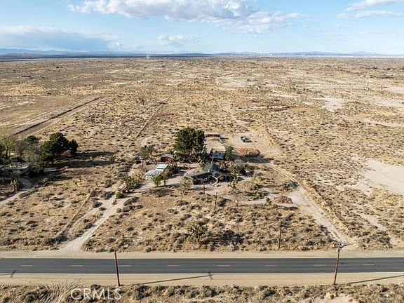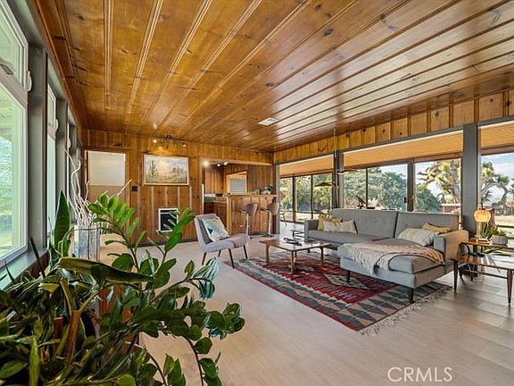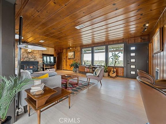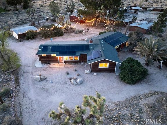 Mid-Century Desert Retreat on 20 Magical Acres. Welcome to The Starburst Ranch, a soulful 1950s time capsule tucked away in the Mojave's quiet outskirts. Surrounded by iconic Joshua trees, native sage, and stunning panoramic mountain views, this estate is a celebration of timeless design and clean lines. Step inside and take in the rich character—floor-to-ceiling windows that connect the inner space with the surrounding desert, custom wood built-ins, warm walnut paneling, and a slate-wrapped wood-burning fireplace that anchors the open living space. A vintage kitchen with a bar counter flows into the dining area, perfect for entertaining against a backdrop of endless desert sunsets. Modern upgrades blend seamlessly with original charm: paid-off solar panels, central HVAC, updated plumbing, electrical, well pump, windows, and more offering both style and energy efficiency. Two spacious bedrooms, two bathrooms, a pause-worthy hallway with ample storage, and a large bonus room with a private entrance offer flexibility for guests, studios, or your creative vision. Outside, curated zen landscaping, string lights, and a firepit create the ultimate gathering space under the stars. A detached studio with a mini split and Italian corkboard flooring (ready to install) expands the possibilities—ideal for artists, writers, a gym, or office. The detached 2-car garage, animal pens, and multiple subdivided APNs (included) extending about 1/2 a mile back from the entrance street, add investment potential. Enjoy extra storage space with an in-ground basement-type pool conversion. This cinematic location also generates income as a film set and has served as a canvas for creatives seeking inspiration from nature's muse in the quiet beauty of desert living. Whether you're looking for a primary residence, a serene getaway, or a one-of-a-kind investment, this gem invites you to slow down, breathe deep, & stay a while. Where silence speaks volumes - and the desert calls you home.