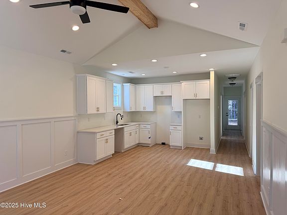 Thoughtfully designed with open-concept living, the home features vaulted ceilings with a striking exposed beam, custom trim work, and no carpet anywhere—a perfect combination of style and low-maintenance living. The kitchen is both functional and welcoming, showcasing quartz countertops, stainless steel appliances, abundant cabinetry, and a spacious walk-in pantry ideal for cooking or entertaining.