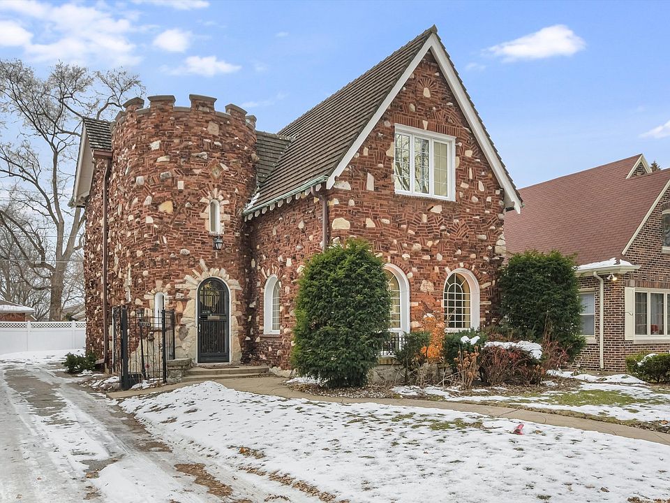 Stunning Mini Castle with Timeless Brickwork & Unique Architectural Charm This one-of-a-kind home showcases exquisite brickwork and classic architectural details throughout. The main level offers a well-appointed kitchen, a convenient half bath, a main-level bedroom, and a formal dining room ideal for gatherings. The sunken living room features elegant arched windows, creating a warm and inviting living space. Step outside to an impressive screened porch with an additional deck, perfect for entertaining or relaxing year-round. A beautiful winding staircase leads to the second level, which includes three spacious bedrooms and a full bath. The full basement provides excellent additional living and entertaining space, complete with a half bath and a bar. A truly unique property offering character, comfort, and exceptional entertaining spaces-must see to appreciate.