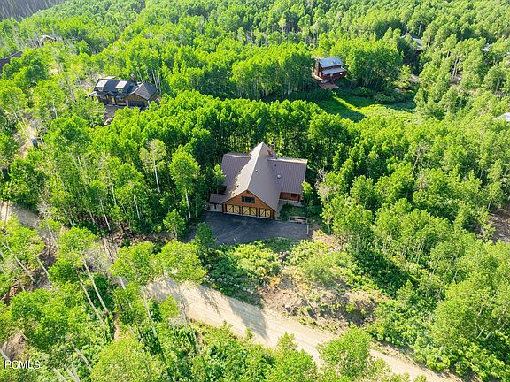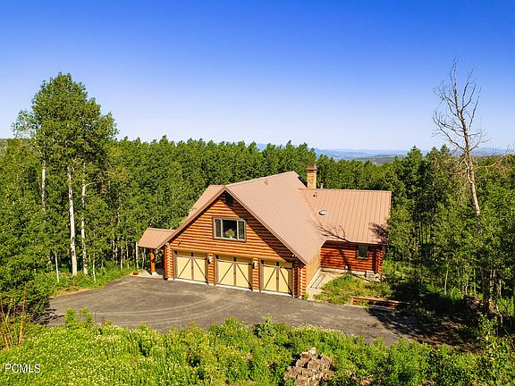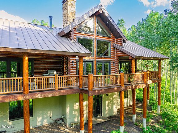 Experience INCREDIBLE PRIVACY of the forest as you are surrounded by tall Aspen trees and enjoy the numerous types of wild life as you peer off the deck. which is 14' off the ground. Know that exterior of the house has been well taken care. Just recently, each log was hand-sanded and individually hand-brushed with STAIN with chinking meticulously hand-applied between each log. A new METAL roof was just installed with heat tape to help prevent ice dams. On the interior of the house, there is radiant heat throughout, even in the garage. You always have a warm car when you drive out into the cold wintery weather. The main log pole is 36' high, over 5 feet circumference and goes from the basement all the way to the ceiling of the main floor. The kitchen cabinets are CUSTOM MADE out of maple and the countertops are a beautiful dark blue GRANITE. The 20' FIRE PLACE is natural flat stones with a unique mantel. The lighting fixtures are custom designed with the Aspen leaf theme. The floors are hard Hickory wood, slate and stamped concrete and a little bit of carpeting. The conditioned attic has 6'' of closed cell foam installation that provides a more even temperature throughout the house and improves the cost savings of energy for heating the home. There are two 1000-gallon propane tanks buried in the ground that are owned. This mountain retreat offers plenty of room for house guests and with 3-car heated garage, which allows plenty of room for toys. The paved driveway also provides parking for several cars and easy access into the house. The 60' X 12' WIDE DECK allows you plenty of room for entertainment, enjoying the night sky and watching the animals. Conveniently located off the main road and set back far enough to offer peace and seclusion. For SNOWMOBILERS, it allows you to travel on snow packed roads and is only a few minutes away from the gate into the National Forest.