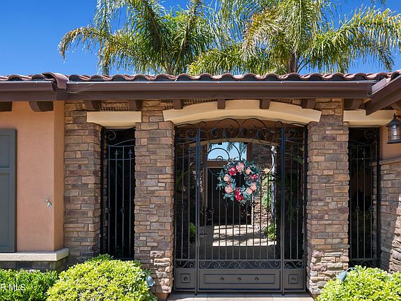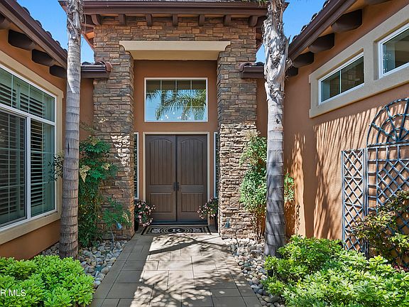 Imagine yourself in this stunning, single-story oasis boasting 4 bedrooms, 4.5 baths and spanning just over 4000 square feet. Built in 2016 by The Toll Brothers, this is the Santa Fe model located within the highly desirable and gated Masters community. The neighborhood is nestled in the foothills above the city of Moorpark and near the acclaimed 27-hole Moorpark Country Club. The custom, gated courtyard features soaring palm trees, lush plant life, and blooming flowers. The double front entry doors open to a bright, open floor plan featuring hardwood floors, 12 ft. and 16 ft. ceilings, an expansive great room, breakfast nook and modern chef's kitchen. The kitchen boasts a beautiful wrap-around stone counter island with a farm sink, a second island with a prep sink, stainless appliances including a Sub Zero refrigerator/freezer, double oven, microwave, Wolfe 6-burner cooktop with griddle, dishwasher, wine cooler and walk-in pantry. Separate formal dining room could potentially be converted into an office space. The spacious master bedroom suite features sliding doors to the backyard, a cozy sitting area leading to master bath with beautiful stone counters at the double vanity, an oval soaking tub, shower and custom-designed master closet. Three additional bedrooms are on the opposite side of home, each with an ensuite bath. Don't miss the large laundry room and door to the side yard that includes a dog run, fruit trees and parking for 5th car behind the double gate. The great room flows seamlessly through triple sliding pocket doors to a tropical paradise backyard featuring a 48' pebble finish pool and spa, a water feature, an outdoor gas firepit, and slat roof patio cover with automatic screens for sun protection. Enjoy entertaining outdoors with gas BBQ, griddle, ice maker, sink with garbage disposal, hot water, stainless drawers, ceiling fans, overhead electric heaters, shade awning and room for 12 guests at the bar. The front and rear yards have been professionally landscaped with 98% drip irrigation. Enjoy lower electric bills with completely solar home and worry-free back-up Generic 2400 unit.