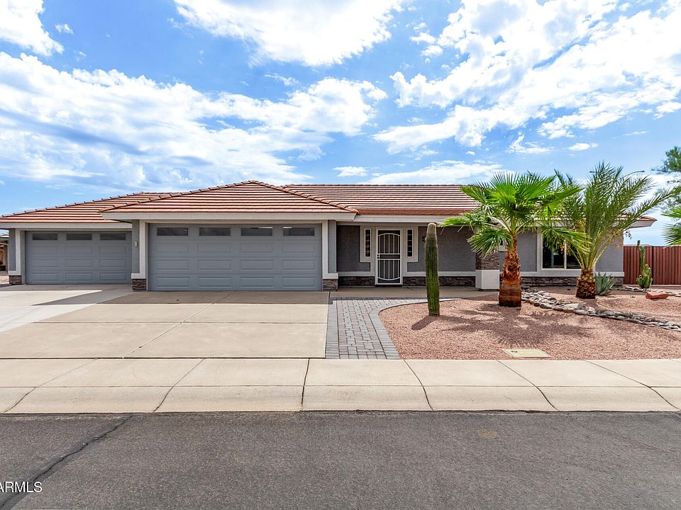 Nestled on a PRIME corner lot! This home was almost completely rebuilt in 2019 and has 3400 sf under roof! Lovely curb appeal includes a 6-car garage, RV gate, and easy-care desert landscape. Inside, discover a large living room with vaulted ceilings, wood-look tile flooring, and fresh paint throughout. Wide sliding glass doors in the desirable great room ensure an effortless indoor-outdoor living experience. Upscale kitchen comes with abundant cabinets with crown moulding, recessed & pendant lighting, SS appliances, quartz counters, desk area, and a convenient breakfast bar. Serene main retreat offers plush carpet, two six-panel door closets, and an ensuite with dual sinks. Finally, the spacious backyard has a storage shed and a covered patio where you can spend quiet mornings. Hurry!
