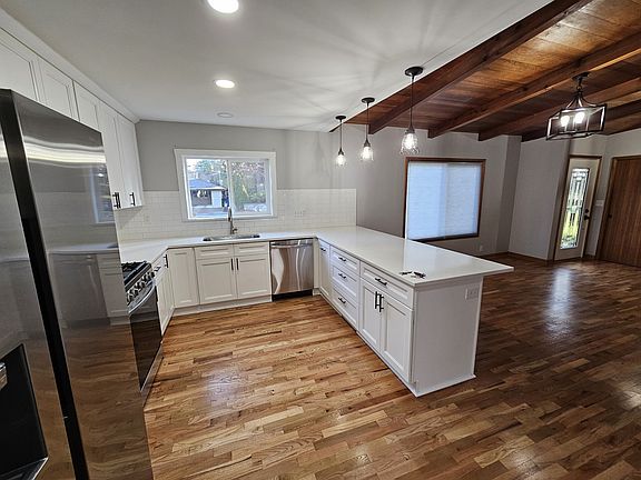 Charming 1950s ranch style, 3 bedroom 2 bath 1700 sq feet - one level home on quiet dead end street in Tigard, OR. Hardwood floors throughout with vaulted ceilings/exposed beams. Recently renovated kitchen with new appliances & updated bathrooms. Large spacious rooms and wood burning fireplace in family room and dining room. Expansive covered patio for year around BBQ. Fully fenced, level lot with playhouse, shed, garden beds and dog run. Great freeway access to I-5 & 217, near Washington Square Mall, with access to restaurants and shopping. Schools: Metzger Elementary, Fowler Middle School & Tigard High school Call Andrea or Kevin for appointment/application Rent: $3100 Security Deposit: $3100 $40.00 application fee for all persons 18yrs and older for credit check and background check. References and Employment verification also required. Yard Maintenance negotiable Additional deposit required for pets Utilities paid by tenant: Electricity, Water/Sewer, Gas Heat, Garbage Rental Insurance required. Minimum 1 yr lease required.