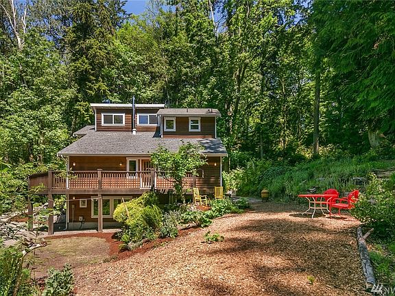 The ultimate woodland sanctuary! This exceptionally pretty, light-filled home is nestled in a magical forest on Vashon's desirable west side, mere minutes from Seattle ferries. Leave the stresses of modern life behind - this light-filled home invites you to relax and recharge amid the beauty of a peaceful island forest. The contemporary northwest design is ideal in this setting, with walls of windows to showcase the surroundings and soaring ceilings that add to the sense of space and serenity. Gleaming wood floors and wood trims complement the open floor plan, as does the wood stove and custom finishes throughout. A bedroom and 3/4 bath are on the main level; the upper floor loft is devoted to a delightful master en suite. A daylight basement with half bath has so many possibilities! A deck wraps around two sides of the home, perfect for relaxing amid birdsong and gentle forest breezes. Whimsical garden touches around the home blend beautifully with the natural setting! The shy three-acre property adjoins Fern Cove and Shinglemill Creek, a 168-acre nature preserve, so peace and quiet is assured. When it's time to venture out, Vashon's shops are not far away!