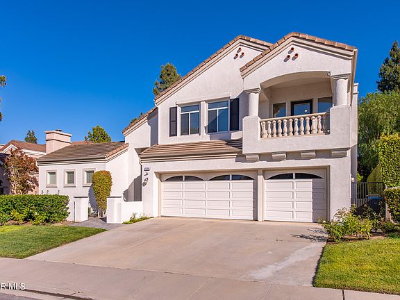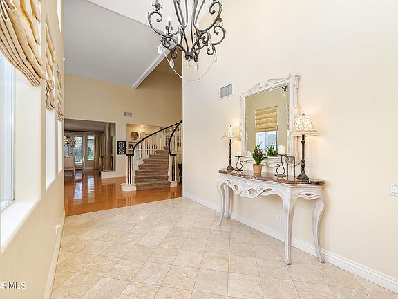 Look again!! This 4,003 sq.ft. 5 bedroom home is THE LOWEST PRICED per sq.ft home in all of Moorpark!! (as of this time of this writing). Magnificent tree lined streets lead you to this grand 5 bedroom 4.5 bath home with double door entry. You will be greeted by soaring cathedral ceilings in the elegant living room with the first of 4 gas fireplaces. High ceilings, sweeping staircase, large foyer and lots of windows fill the home with light as you enter. A private downstairs bedroom with en suite bathroom can be used as a traditional bedroom or a home office with a built-in desk. The French doors leading to a secluded patio ensure this space is special for guests or working from home. A formal dining room also with French doors to bring the outdoors in. Stop by the wet bar on your way to the family room with a gas fireplace, built-in speakers, and more windows to enjoy this light and bright room! The kitchen has a large eating area, 5 burner gas stove, double oven, center island, pantry with pull out drawers, and designer cupboards, some with glass doors. The elegant staircase leads you to an open hallway to access 4 bedrooms. Each room has a ceiling fan and direct access to a bathroom. Two rooms lead into a Jack-n-Jill style bathroom. The primary bedroom has room for a seating area to enjoy a cozy gas fireplace, crown molding and built-in speakers! Two separate walk-in closets and the bathroom also boasts separate sinks, a standup shower and sunken tub. Outdoors enjoy the covered patio's built-in stacked stone fireplace, gas bbq fountains and mature Meyer lemon tree! Of course, there is a, indoor laundry room with lots of storage and a 3 car garage. You also have access to two association pools and two clubhouses to enjoy making this a special place to call home!