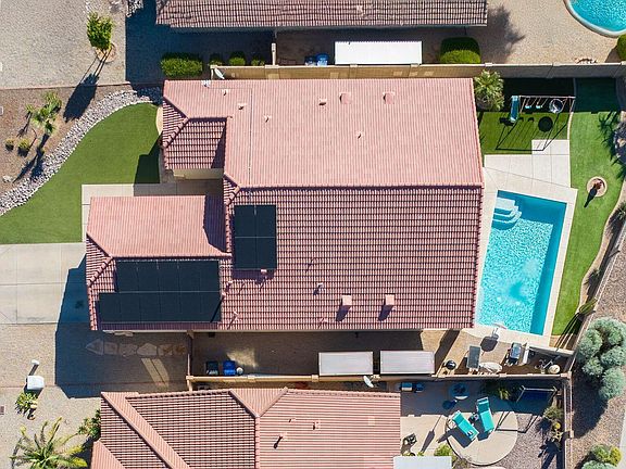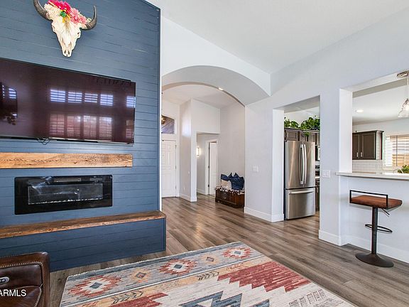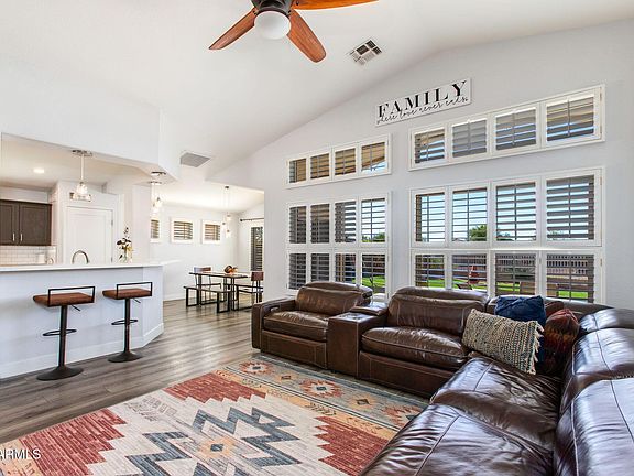 Beautifully updated 4BR/2BA Mesa home tucked on a quiet cul-de-sac backing to a greenbelt! Bright, open layout with soaring ceilings, plantation shutters, and waterproof LVP flooring. Kitchen features stainless appliances, breakfast bar, and ample storage. Primary suite offers a tiled shower, jacuzzi tub, dual sinks, and custom walk-in closet. Extra-deep garage with great storage. Major updates: HVAC & furnace (5 yrs), water heater (3 yrs), softener (1 yr), pool 2012. Backyard oasis with sparkling pool, turf, and covered patio—no rear neighbors! BONUS: Seller paying off solar at COE. Desirable HOA community near parks, dining & top-rated Mesa schools. Move-in ready!