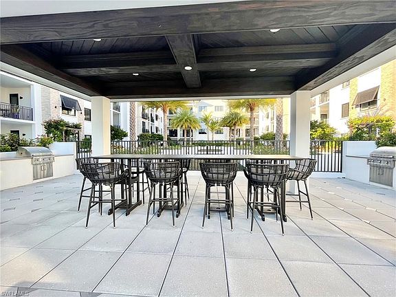 Available March 1. This newly listed seasonal residence at Naples Square's newest building was completed in 2020. This artfully designed and decorated west-facing residence includes a 260-square-foot balcony. With great room, dining area, island kitchen, two beds, and two full baths, this home offers an ideal downtown pied-a-terre. The gourmet kitchen's bar and food preparation area features a gas cooktop, wall-mounted oven, and European frameless construction, full-overlay cabinetry. The open feeling continues with a dining area that merges with the great room's seating area. 10-foot ceilings, 8-foot solid core doors, 8-foot glass doors, 8-inch clean-lined baseboards, and 7-inch crown molding. Naples Square III, with a walkable/bikeable lifestyle, brings cohesion to downtown, connecting Fifth Ave and beaches to Bayfront and the Greenway, Baker Park, and Design District. Naples Square offers an elevated, exclusive landscaped courtyard with a pool, cabana bar, and lounge areas with fire tables. Covered, secure garage parking is included with second assigned space available, as well as a state-of-the-art fitness center, and an event room with a catering kitchen.