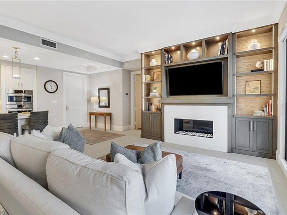Welcome to your elegant new home in Naples Square, where luxury living awaits! This stunning residence offers two bedrooms, a versatile den, and two full bathrooms within 1,593 square feet of thoughtfully designed space. Step into the spacious and bright open living area, anchored by a gourmet kitchen that is sure to impress. Enjoy cooking and entertaining with a large island, sleek quartz backsplash, upgraded cabinetry, Bosch appliances, a wine cooler, and an extra beverage refrigerator. The guest bathroom boasts a remodeled shower, while the primary bathroom offers an indulgent rain showerhead for a spa-like experience. Both bedrooms are equipped with custom California closets, including His and Her closets in the primary suite, ensuring ample storage space. Beyond the sliding glass doors, an extra-large, extended terrace awaits, offering a perfect spot to relax and unwind. From your patio, you have direct access to the the dramatically redesigned community courtyard, where you'll find two cozy firepits, a large pool and spa, two grills for outdoor cooking, and a grand gazebo, all enhancing your outdoor living experience. Your reserved garage parking space is also equipped with an electric car charging station. This Naples Square residence offers a luxurious lifestyle that is truly not to be missed. Come and see for yourself the elegance and comfort that await you!