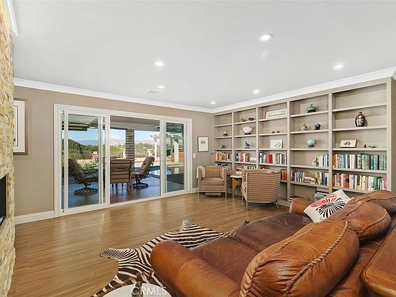 Enter through grand double doors into an expansive living space featuring a glass-enclosed gas fireplace and open-concept living and family rooms, each offering stunning views of the Canyon Crest Golf Course, the Box Springs Mountains, and majestic Mt. Baldy. By day, enjoy the serene landscapes, and by night, be enchanted by the twinkling city lights and the San Bernardino mountains in the distance. Designed with sophistication in mind, the home boasts porcelain tile flooring, built-in bookcases, recessed lighting, and a striking granite wet bar with a hammered copper finish. Custom lighting over the dining table and bar adds a touch of artistic flair.