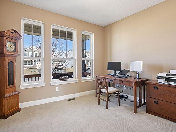 Welcome to this stunning south-facing two-story home in the highly desirable Crosswinds neighborhood. The open-concept floor plan is flooded with natural light, creating a bright and inviting atmosphere throughout. The main level boasts a great room with in-ceiling speakers, home office with French doors, hardwood floors, 9-foot ceilings, and a spacious kitchen featuring a large center island, 42" cabinets, granite countertops, subway tile backsplash, and stainless-steel appliances. The mudroom is equipped with cubbies and coat hangers, and the adjacent laundry room offers additional counters and cabinet space for convenience. Upstairs, you'll find four generously sized bedrooms, including a luxurious primary suite complete with French doors, a ceiling fan, a walk-in closet, and a private bath featuring a separate shower with tile surround, a soaking tub, and double sinks. The lower level is perfect for entertaining, offering an expansive amusement room and a game area with a wet bar. A fifth bedroom and a ¾ bath complete the lower level. Outside, enjoy an impressive outdoor living space with a massive patio, built-in kitchen, hot tub and fire pit area—ideal for gatherings and relaxation. The home is ideally located near the neighborhood park and just minutes from Target, Kwik Trip, grocery stores, coffee shops, Lola’s, and Lake Waconia. Freshley painted interior! Compare this home to new construction and see the incredible value for yourself!