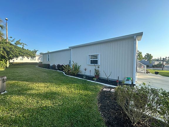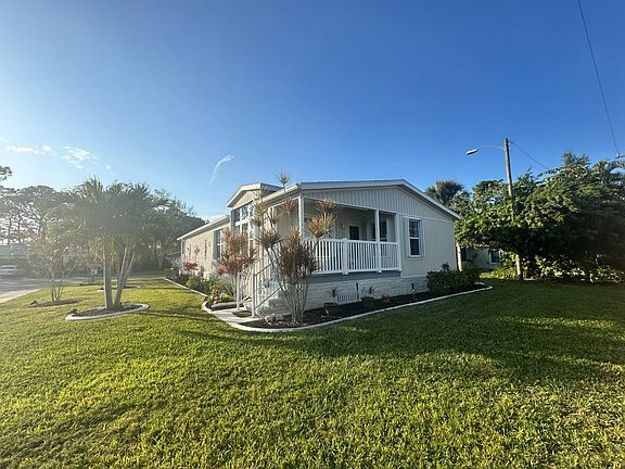 Beautiful 2018 Skyline home with split floorplan is tastefully updated and is being sold mostly furnished. This 2-bedroom/2 bathroom has an office which could be converted into a 3rd bedroom. As you go up the stairs to the front door, you are greeted by a small front porch with Trex decking, ceiling fan, and 2 wicker rocking chairs. When you enter the home, you will see the beautiful laminate flooring. The office has a built-in desk with a filing cabinet and loveseat. The guest bedroom has a queen bed with a nightstand and walk-in closet. The main bathroom has a tub with a shower and tube skylight. The laundry is located in a hallway closet outside of the guest bedroom. The kitchen is large and open with lots of cabinets and granite countertops, tile backsplash, and tube skylights. The kitchen has a high breakfast bar with high-top bar stools. The dining area has a large space for a table with chairs and has a China cabinet. The main living area is very large with recessed ceilings, ceiling fan, and lots of natural lighting. There is a couch, tables, cabinet, and large TV on the wall. The primary bedroom has a king bed with power controls, dressers, nightstands and a ceiling fan. The primary bathroom is large with double sinks with granite countertops, tile walk-in shower, lined linen closet, and walk-in closet. The back porch has a ceiling fan with Adirondak chairs. It is an oversized garage with cathedral ceilings and plenty of storage, freezer, and shelving. It has a hurricane garage door with screen door. There are laminate floors throughout the home with carpets in both bedrooms. This home has fantastic features: crown molding, accordion hurricane shutters, extended driveway, freshly painted, updated bathrooms, beautiful landscaping, and newer appliances. Only a few minutes to one of the five pools & hot tubs, clubhouse, & fitness center as well as tennis courts, pickleball courts and golf course. This community has a full social calendar and activity schedule. Plenty to keep you busy! This is a 55+ (very active) community.
