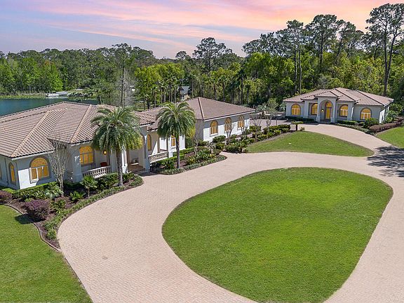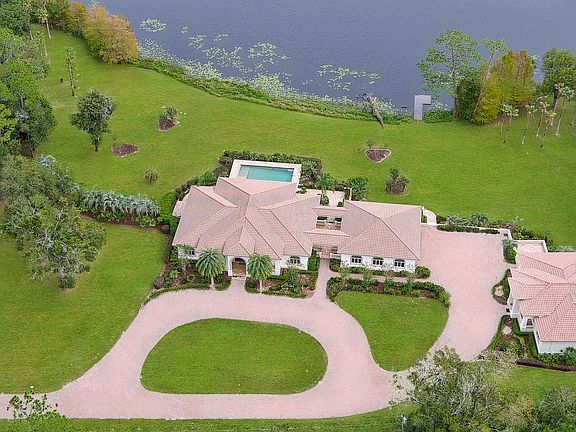 Exceptional 9-acre, 9 car garage lakefront estate with guest home, pool, outdoor kitchen and more, zoned for horses and no HOA. Only 38 minutes to Orlando and 30 minutes to the beaches! A Car enthusiast dream come true! This extraordinary lakefront compound offers a rare blend of luxury, privacy and versatility. Custom-built by the Troy Building Company, this estate includes a 3-bedroom, 3-1/2 bath main home with the flexibility to convert to a 4th bedroom. The Guest home enjoys over 2000' of living area with 2-bedrooms, 2-baths. This estate has over 6,000 square feet of heated and cooled living space and more than 11,000 square feet under roof. The main home and guest house boast elegant finishes including top-of-the-line MasterCraft solid wood cabinetry, granite countertops and ceramic tile flooring throughout. Soaring 14-foot ceilings create a grand sense of space, while the main home also features a cozy fireplace that is ready with a gas line. The heart of the home opens to a slide-away screen and covered porch with an exceptionally equipped outdoor kitchen, ideal for entertaining year-round. The private guest home offers complete independence with its own full kitchen, dining room, living area and slide-away screening on the porch, ideal for extended family, long-term guests, or generating rental income through short-term or long-term leasing. It offers all the same high-end finishes and thoughtful design as the main residence, ensuring comfort and luxury for any use. Enjoy serene lakefront living with your own private pier and unwind in the oversized, heated and cooled 15-by-37-foot pool, featuring a remote-operated electric pool safety cover for convenience and peace of mind. A paver-lined circular driveway stretches from the gated entrance to the front of the home, creating a striking first impression. The Nine-car garage, connected with a breezeway to the main home, currently includes a climate-controlled 29-by-15-foot workshop for hobbies, storage or creative space. A separate 17-by-25-foot block storage building provides additional space for tools or equipment. Built with well-insulated block and stucco construction, this property offers exceptional durability and energy efficiency. While a portion of the acreage includes the lakefront, the land is fully fenced, making it ideal for horses, pets or added privacy. Whether you're seeking a private retreat, multigenerational living, income-generating potential, or an equestrian-friendly sanctuary, this unique estate delivers the best of Florida living, luxury, privacy and convenience in one incredible package. Just a short drive to Florida's popular beaches and world-renowned Orlando theme parks and entertainment, this estate offers a balance of peaceful seclusion and easy access to everything Central Florida has to offer.