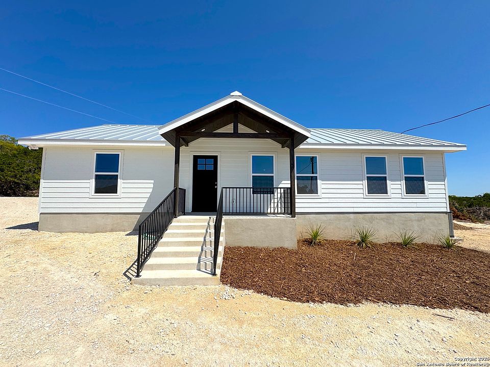 Welcome home! This stunning, newly constructed farmhouse-style residence sits proudly on a spacious corner lot, offering picturesque views from the inviting covered front porch. With thoughtful design and upscale finishes throughout, this home blends timeless charm with modern convenience. Step inside to a bright and airy open floor plan, highlighted by vaulted ceilings and durable vinyl flooring that flows flawlessly throughout the home. The heart of the home is the beautifully appointed kitchen, featuring a large center island, granite countertops, and stainless-steel appliances-including a refrigerator-perfect for everyday living and entertaining alike. The spacious primary bedroom is a relaxing retreat with an en-suite bath. Enjoy a custom-tiled shower with a sleek glass door, a rich wood vanity topped with elegant marble, and premium fixtures throughout. This home is built with quality features, including a standing seam metal roof for lasting durability, 3.5" spray foam insulation on all exterior walls, and a fully decked, conditioned attic space for extra storage. Energy efficiency abounds with a 20 SEER HVAC system and a tankless water heater for continuous hot water. Outside, you'll love the low-maintenance landscaping in front with a circular driveway, lush Bermuda grass in the backyard, and mature trees that provide added privacy. There's no HOA to worry about-giving you freedom and flexibility. Located just a short drive from shopping, dining, and everyday amenities, this one-of-a-kind property offers the perfect blend of rural serenity and suburban convenience. Come see it today and fall in love!