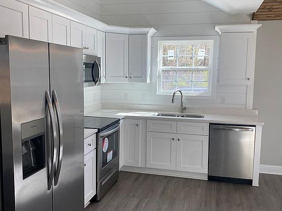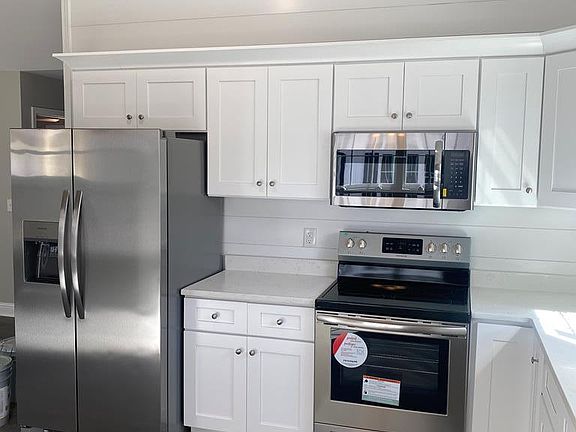 Open floor planSolid surface countertopsWhite cabinetsEat-in kitchenBuilt-in microwaveGray paint