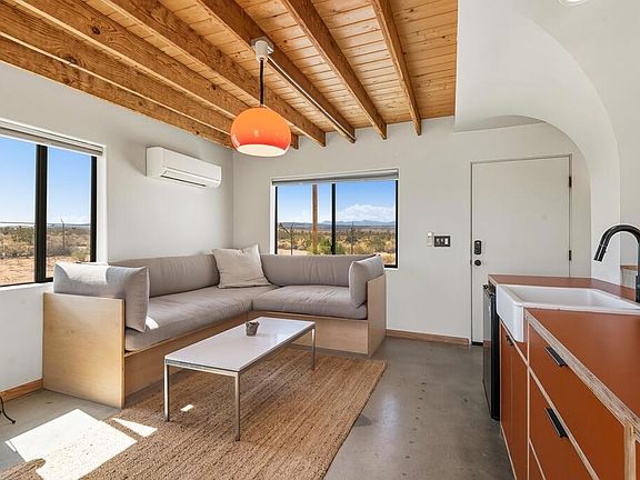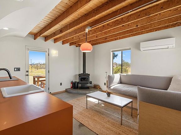 Discover this stylish modernized Spanish-style desert retreat, perfectly set on a fully fenced and gated 5.5+ acre parcel offering privacy, serenity, and endless potential. Turnkey furnished, this home is ready to enjoy as a personal escape, weekend getaway, or investment opportunity. The interior showcases exposed wood beams and a rich wood ceiling, creating warmth and character that blend seamlessly with the desert surroundings. The open floorplan connects the living area and kitchen on one side, with the living room featuring a cozy wood stove and the kitchen highlighted by bold orange cabinetry, induction stove, and mini fridge. The bedroom area includes built-in wood shelving for storage and hanging space, offering both function and charm. The updated bathroom has a vibrant blue tiled shower and skylight. Go outside to a spacious patio for lounging and entertaining, where you can soak in the panoramic desert landscape and breathtaking views in every direction. With plenty of land for expansion or simply to enjoy the peace and quiet, this unique property offers a rare chance to own a private desert hideaway that combines style, comfort, and versatility.