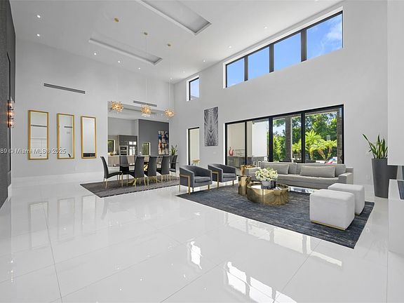 Modern masterpiece on expansive grounds, boasting soaring 20-ft ceilings, sleek porcelain floors, and a chef’s kitchen with custom cabinetry and quartz counters. Six spacious bedrooms each offer private ensuite baths and custom walk-in closets. The lavish primary suite features a serene sitting area, dual walk-in closets (his and hers), and a luxe glam room with built-ins for shoes, handbags, and makeup. A private elevator provides access to the second level, where you’ll find a stunning home theater, bar, and kitchen. Outdoors, indulge in resort-style living with a saltwater pool, spa, summer kitchen, covered terrace, and an impressive driveway with a 3-car garage. Smart, energy-efficient, and built for ultimate contemporary living.