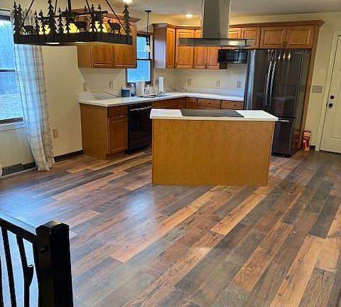 Property offers tranquility and convenience. Front porch with large wooden double doors. New wood tone laminate flooring. Kitchen has beautiful new cabinets and countertops with diagonal kitchen island with vent hood. The open concept of the kitchen and dining area offers a spacious atmosphere perfect for entertaining. 2 bedrooms on the main floor, one features a large walk-in closet. Laundry on main floor; including a stackable washer and dryer. another laundry hookup in the downstairs basement. Walkout basement with large great room/recreational room and 2 of the 4 bedrooms. A bath with a standup tile shower. Laundry hookup HVAC. Tankless water heater. Guttering. Attached garage and a large detached 16x36 shop/garage with electric. Call for appointment.