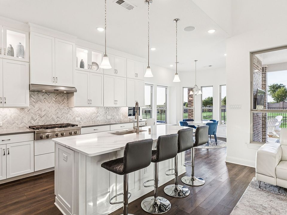 Beautifully designed 2019 home on a cul-de-sac in the desirable Trailwood community, served by top-rated Argyle ISD. Bright, open layout with soaring ceilings, wide-plank hardwood floors, and expansive wall of windows that fill the home with natural light. The gourmet kitchen features shaker cabinetry, designer backsplash, oversized island, and commercial grade gas cooktop. The floor plan includes a private study, luxurious primary bedroom with spa inspired bath, and a guest suite conveniently located downstairs, ideal for multi-generational living. Upstairs offers a spacious game room, media room, and two bedrooms each with their very own full bath for added privacy and comfort. Enjoy outdoor living at its best with a covered patio, resort-style pool and spa, tanning ledge, and peaceful greenbelt views. Convenient to shopping, dining, and community amenities. A perfect blend of style, function, and location!