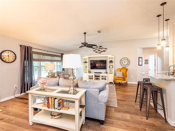 A BEAUTIFUL EVER POPULAR LEXINGTON MODEL LOCATED IN THE PARK VIEW WEST NEIGHBORHOOD OF OAK RUN C/C. THIS HOME IS UPGRADED AND MAINTAINED TOO PERFECTION. DOUBLE DOOR ENTRY LAMINATE FLOORING IN THE LIVINGROOM AND DININGROOM. VAULTED CEILING. UPGRADED OPEN KITCHEN WITH SXS APPLIANCES, QUARTZ COUNTER TOPS, EATING AREA WITH PLANTATION SHUTTERS, LARGE MASTER SUITE WITH HIS AND HER'S WALK-IN CLOSETS, REMODELED MASTER BATH WITH NEW VANITY AND DOUBLE SINKS, NEW TILE IN SHOWER WITH GLASS DOORS, 2 GUEST BED ROOMS WITH GUEST BATH, 10X16 LANAI ENCLOSED IN THERMAL PANE GLASS UNDER H/A. 12X20 PATIO WITH A FIRE PIT FOR YOUR OUT DOOR PLEASURE, NEW ARCHITECTURAL ROOF IN 2011, NEW A/C 2020, NEW WATERHEATER 2020. THIS HOME SETS IN A CUL-DE-SAC WITH PRIVACY AND BEAUTIFUL LANDSCAPEING.