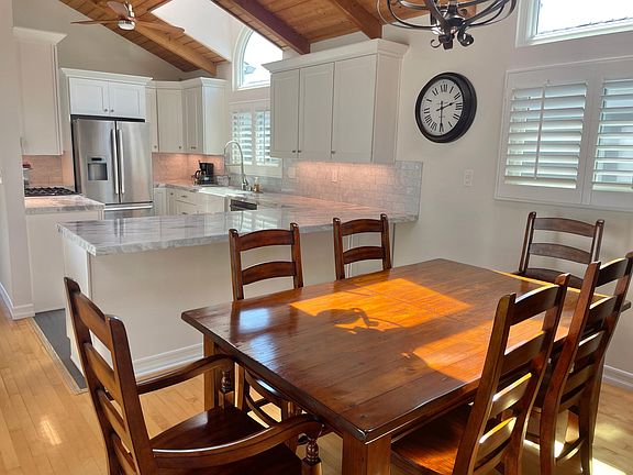 This beautifully maintained beach home with ocean views comes fully furnished! Nestled on a quiet street just a short walk from the sand, it features rich wood floors, vaulted beamed ceilings, and sun-drenched interiors thanks to multiple skylights. The remodeled kitchen and baths blend style and function, while the oversized primary suite opens to a private ocean-view patio. Two large bonus rooms provide perfect spaces for a home office or media lounge. With a tranquil backyard lined with palm trees, 2-car parking, laundry, and all essentials included pots, pans, linens, and bedding this big home comfortably sleeps six and is ready for you to move in and enjoy. Completely furnished. Just bring your clothes! Looking for a year or more.