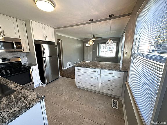 Welcome to ranch living in Wyandotte, MI. As you walk in to the open concept front room and kitchen you will be ready to enjoy this move in ready and recently remodeled home. Including refinished hardwood floors, fireplace, and primary suite.with its own private bathroom with walk in shower.Your remodeled kitchen includes granite countertops, soft close cabinets, tile flooring, stainless steel appliances, dishwasher, and counter height seating.Cozy up to the wood burning fireplace this winter in the back area family room.Use the front two bedrooms for an office, guest room, or for the kids with access to the tiled front bathroom with tub. Enjoy the fenced in backyard with your dog or children.