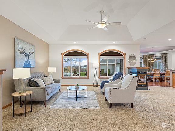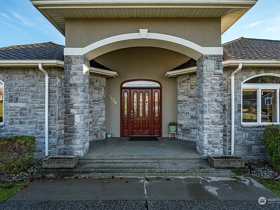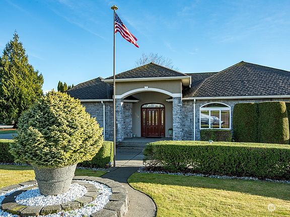 Breathtaking Mt Baker & Twin Sisters View from this nearly 4,000 sq foot custom home on a .69 manicured lot with striking stone entry. Spacious, thoughtful floor plan with gourmet kitchen, formal dining room, office, recessed ceilings, wet bar, glass natural gas fireplace, & picture windows to soak in the views. Massive primary suite with walk in closet, private bath with vanity, & soaking tub. Guest bedrooms with Jack & Jill bathroom. Utility room with half bath. 13' X 24' bonus room is excellent for home business or gym. Attached 3 car garage with additional 40'7" X 25'11" heated RV/Boat garage. Entertaining on the back patio is a dream with gas BBQ & landscaped yard, only bested by quiet mornings witnessing the sunrise over Mt Baker.