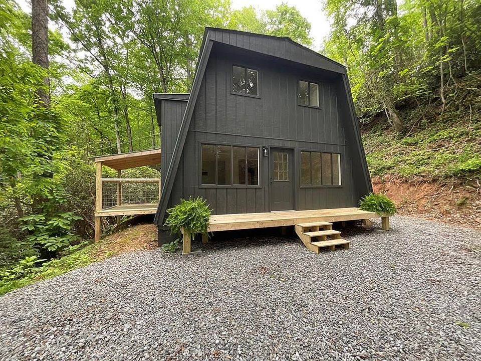 Tucked away in the tranquil Granny Squirrel community, this fully remodeled 3-bedroom, 2-bath A-frame cabin is a quiet woodland escape just minutes from the Nantahala Outdoor Center. Inside, fresh paint and new hardwood floors set a warm, welcoming tone. The brand new kitchen offers butcher-block counters, new appliances, and abundant cabinetry. Both bathrooms feature modern fixtures and clean finishes. A versatile loft works beautifully as an office, guest area, or reading nook, with generous closets throughout. A spacious deck overlooks the trees and nearby creeks—perfect for morning coffee or evening relaxation. The surrounding area is an outdoor lover's playground: Nantahala River whitewater rafting (Class II–III) Appalachian Trail and Bartram Trail hikes with frequent waterfalls, Tsali Recreation Area's acclaimed mountain-bike trails, trout fishing in local streams and the Nantahala tailwater. Access note: the driveway is a little steep (4WD/AWD recommended in wet weather), but the parking area can easily be regraded and expanded for gentler access—plenty of room to create a level pad if you choose. Flexible ways to make it yours: Owner financing or Lease-with-option-to-buy. Move-in ready. Schedule your private tour this weekend.
