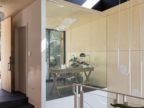 Two-story floating staircasesDynamic articulation of planesUnique creased rooflineTriangulated clerestory window