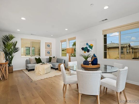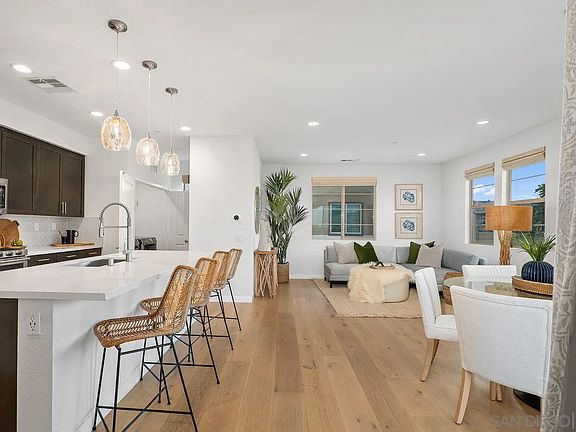 Coastal living with distant horizon Ocean Views. This end unit townhome boasts 9 ft. ceilings, modern finishes, an open floor plan, a flood of natural light & a both an enlarged balcony & patio. 1st floor bedroom with a full bath overlooks tropical patio! Main floor features a spacious kitchen with oversized quartz countertop island open to the dining and living spaces. The large 3rd floor primary bedroom has a stunning ensuite bath and walk in closet. Two more bedrooms share a jack and jill bathroom. Enjoy relaxing around the glass stone fire pit on the largest patio with a built in grill, pizza oven & drop-in cooler. Enjoy relaxing on your balcony with distant horizon ocean views. Garage has an epoxy floor finish along with overhead quality storage racks. Throughout the home there is upgraded new engineered Harwood European Oak flooring. Home feels and lives like brand new construction. Built in 2020. Highly Desired Gated Community! Located in Brisas at Pacific Ridge, Rancho del Oro. Low HOA due.
