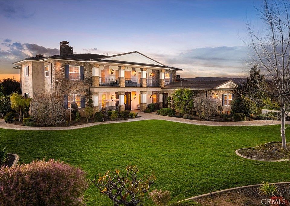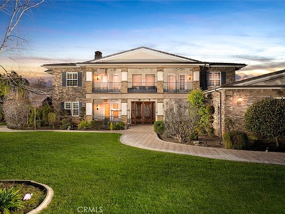 Grandeur abounds in this beautifully maintained executive level home with more upgrades than can be listed! 5 bedroom, 6 bath on .99 acre, with pool, RV garage, plenty of parking, in a very private and quiet area. With mature landscaping and nestled into the hillside of Yucaipa at the base of Oak Glen-the park-like setting is serene and welcoming. Over TWO MILES of Crown Moulding and wainscotting trim the interior of this luxurious and spacious home, in addition to beautiful granite, travertine and marble finishes on floors and surfaces. Ensuite bathrooms in all bedrooms offer comfortable living for everyone, in addition to the first floor powder room. New custom made Avalon wood plantation shutters have been installed throughout. At the heart of the home is a gourmet kitchen with custom Alder wood cabinets, a Viking 6 burner range, Viking double oven and warming drawer, Fisher and Paykel dual dish drawers, Built in Thermador Sub zero fridge, and luxury temperature control wine cabinet. The attached garage offers plenty of parking and built-in cupboards for storage, in addition to the oversized detached double-door RV garage with room for 4+ cars (or RV/toys), plus extra storage, a full bathroom, and room to add living quarters (put in an apartment, office, art studio, gym, or?). The backyard oasis is an entertainer's dream, with covered entertaining areas, plus an Ozone pool and spa with waterfalls for hours of fun in the sun while being very low maintenance. The smart sprinkler system keeps the lovely landscaping irrigated with the touch of a button. A 46 panel solar setup is paid off and included with the property, making the electric bill near $0 monthly! Just a few steps from the main home and garages is the 1200 square foot barn with tack room and 4 horse corrals.