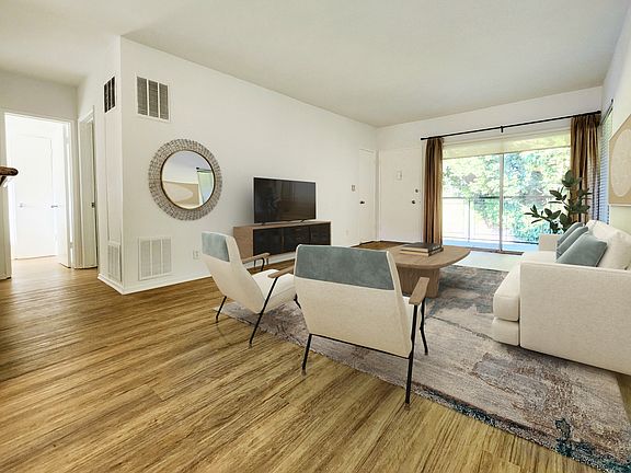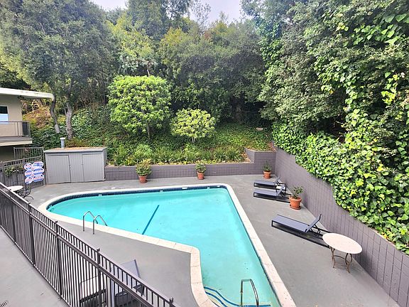 Cozy and cute upper unit has views of greenery and Getty Center! Wood laminate flooring throughout. Kitchen has stainless steel appliances, granite counters, extra storage in pantry closet. Bedroom has two closets with stylish barn doors. Bathroom has separate tub and shower, custom tile, granite counter vanity, large closet. Wall AC in living room. Enjoy the pool area surrounded by rustic landscaping. Community laundry room. One carport space for small car. Great area in Bel Air near local shops.