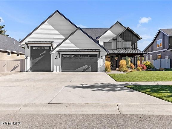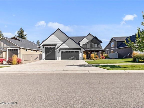 Welcome to this stunning 4-bedroom, 3.5-bath home in the desirable Wyoming Estates neighborhood of Hayden. Built in 2020, this 3,086-sq-ft home seamlessly combines modern design, functionality, and comfort. Step inside to a spacious open-concept layout with abundant natural light, high ceilings, fiberglass black on black windows, and elegant finishes throughout. The gourmet kitchen features a large island, butler's pantry, and high-end appliances, perfect for entertaining or family gatherings. The main-level primary suite offers a private retreat with a spa-style bathroom and generous walk-in closet. Upstairs, you'll find two additional bedrooms, a large great room, and two full bathrooms. The home also includes an attached two-car garage plus an RV garage, providing ample space for vehicles, storage, or hobbies. Outside, enjoy beautifully landscaped front and back yards with sprinkler systems, a covered patio, and room to relax or play. Close to Hayden Lake, schools, and parks!