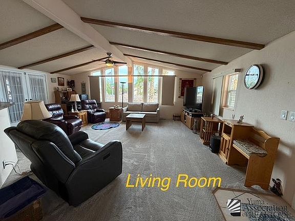 Welcome to this bright and inviting fully-furnished 2-bedroom, 2 bath (one full bath, one 3/4 bath) well-maintained manufactured home in the Yuma East 55+ community. It offers comfort, space and pride of ownership throughout. Natural light fills the home through large windows and 3 French Doors complementing the open floor plan that's perfect for everyday living and entertaining. There is a "Bonus Room" that is ideal as an office, Craft/Hobby room or a Guest Room. Step up into the backyard and enjoy the comfort of a covered patio where a new awning was installed in Aug. 2025 making this outdoor space perfect for your morning coffee, evening gatherings or simply enjoy Yuma's beautiful weather. The front awning was installed in 2022. The AC unit is 5 years old and is serviced annually. There is also a swamp cooler. It has a 1-Car Garage which is a gem in this community and a covered carport. Reverse Osmosis was replaced in Feb. 2025. Conveniently located close to restaurants, hospitals, and shopping centers, and also to the Community Clubhouse, this home offers easy access to everything you need while enjoying the peaceful lifestyle in this community.