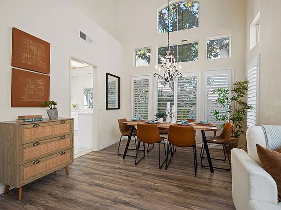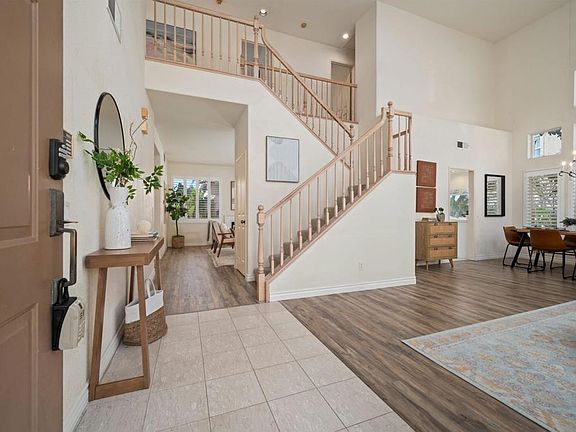 The LARGEST floorplan in the desirable gated community of Versailles. Welcome to this beautiful home which feels like RESORT style living with FULL BED and BATH downstairs and amazing location directly across the street from the pool/spa and open green-belt area/park so you get the convenience of these great amenities within steps...You will be greeted with vaulted ceilings, lots of windows so always light and bright. Luxury vinyl flooring in this living room w/dining area and elegant staircase. Large open kitchen w/white cabinets & lots of counter space, WALK-IN pantry and bay seating area for additional dining. Kitchen flows into the spacious family room with a cozy fireplace overlooking your backyard. Large primary suite with separate tub & shower with large size walk-in closet. All bedrooms are generous in size. This home boasts vinyl fencing and Saltillo style tile in the backyard for EZ maintenance. Walking distance to elementary, middle and high schools. This wonderful home is close to shops, restaurants, parks, breweries, and the Frontwave Arena home to the San Diego Clippers. Just a quick (4 mile) drive to downtown Oceanside with resorts, restaurants, Harbor, Oceanside Pier and SANDY BEACHES.