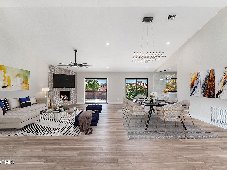 A stunning and completely renovated home boasts an open floorplan, 3 bedrooms, 2 bath 2308 sqft, 2 car garage and covered patio. The kitchen comes with stainless-steel appliances, quartz countertops and brand-new white shaker cabinets. Brand new vinyl wood flooring & upgraded carpet throughout the home. Enjoy the fully upgraded, spa like bathrooms with high end shower system, framed mirrors, shower niche, and custom vanities. An elegantly decorated fireplace with wall to ceiling decorative tile wall to enjoy on those cold cozy nights. Large backyard with a covered patio to escape those hot summers and enjoy mountain views. Located in a lovely desirable neighborhood located close to shopping, parks, schools, and dining. No HOA's A Must see!