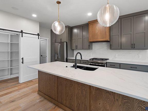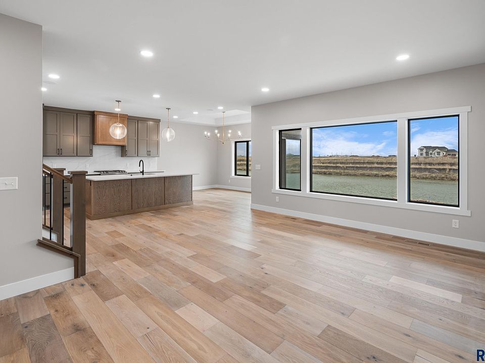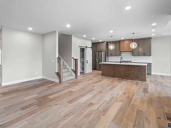 Luxury beachfront twin home with coved 25-ft private beach area on coveted Nine Mile Lake. Ultra spacious design featuring a main level primary suite, perfectly placed main floor office or additl bedroom, as well as 2 addtl bedrooms in upper level & giant loft area & 2nd laundry hookups. Functionality & elegance awaits in the kitchen equipped w/ walk-in pantry, custom cabinetry, stylish oven hood & quartz tops. Designer elements of exquisite fireplace, luxe tile shower in the primary bathroom, integrated home audio, finished & heated garage w/epoxy flooring, & comprehensive landscaping packages. Convenient 8 x 16 covered patio space. Prioritized privacy w/concrete walls separating each twin home as well as a storm shelter for peace of mind. Turnkey living w/HOA covering garbage, lawn, snow removal, road maint. & access to community beach for only $185/mnth. Nine Mile Lake development will feature a community beach & city park.